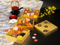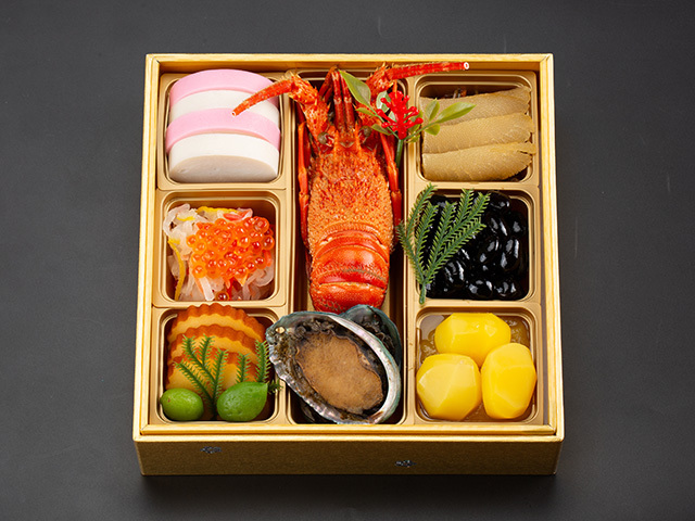 | おせち内容 | <一段重> 紅白蒲鉾 / 紅白なます / いくら醤油漬 / 伊達巻 / 若桃甘露煮 / ロブスター / 鮑旨煮 / 松前漬 / 数の子醤油漬 / 黒豆蜜煮 / 栗金団 <二段重> 叩き牛蒡 / 烏賊黄金和え とびっ子 / 竹の子土佐煮 / 蒟蒻旨煮 / 隠元 / 花麩 / 薩摩芋レモン煮 / 鮭麹味噌焼き / 金柑蜜煮 / 椎茸旨煮 / 海老真丈含煮 / 蛸の磯焼 / 昆布巻 / 焼き海老 / お多福豆 金箔 <三段重> 合鴨テリーヌ / ドライトマト赤ワイン煮 / 赤魚エスカベッシュ / ソフトサラミ / カマンベールチーズ / ブラックオリーブ / 合鴨山椒焼き / 味付ザーサイ / スパイシーミート / ローストビーフ / スタッフドオリーブ / 海老チリソース / 蟹風味サラダ キャビア / カスラハム / ホワイトパストラミ / 中華海月 / 蒸し鶏胡麻ダレ クコの実 / 海老のハニーマスタード / サーモントラウトマリネ ケーパー / 蟹風味のテリーヌ |